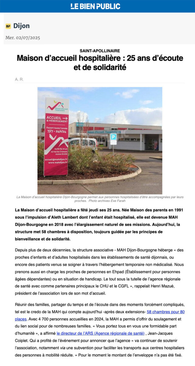 Ce jeudi 26 juin 2025, la Maison d’Accueil Hospitalière Dijon Bourgogne a fêté ses 25 ans d’ouverture, d’évolution et de travail quotidien.