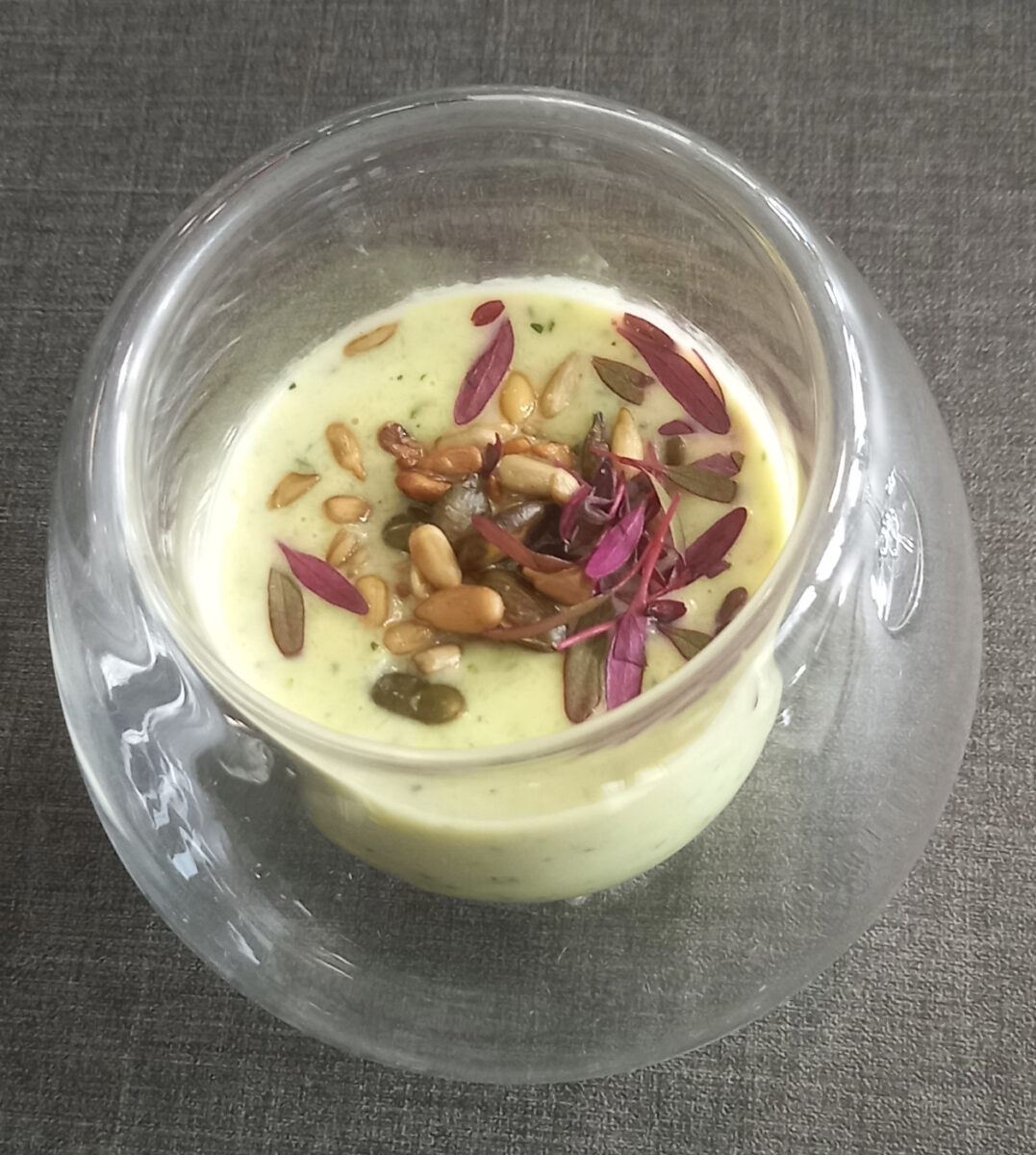 – Oeuf poché, velouté de courgettes rondes de Nice, cubes de boeuf, graines grillées, pousses de saison, fleurs
