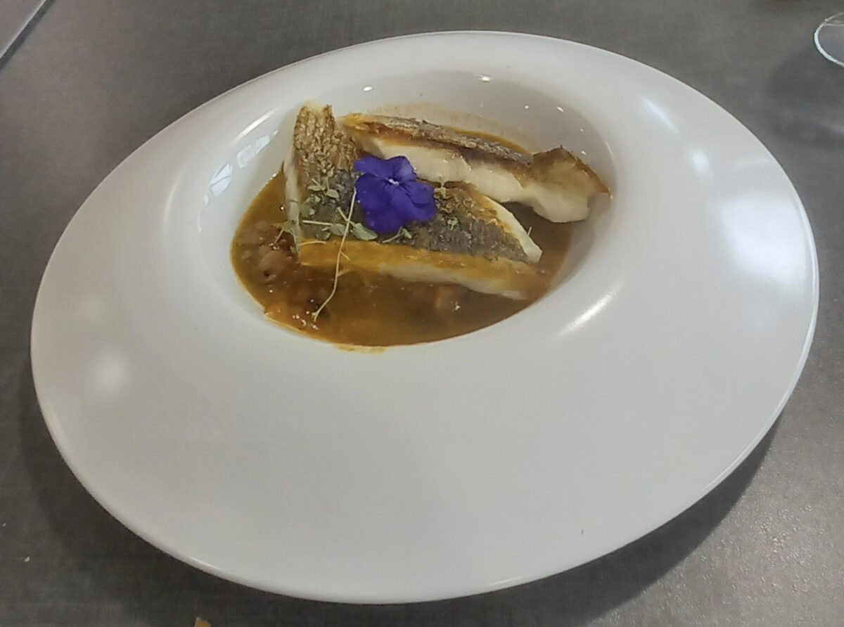– Loup de mer grillé à l’unilatérale sur ratatouille niçoise, et sa sauce de poisson, râpé de citron noir