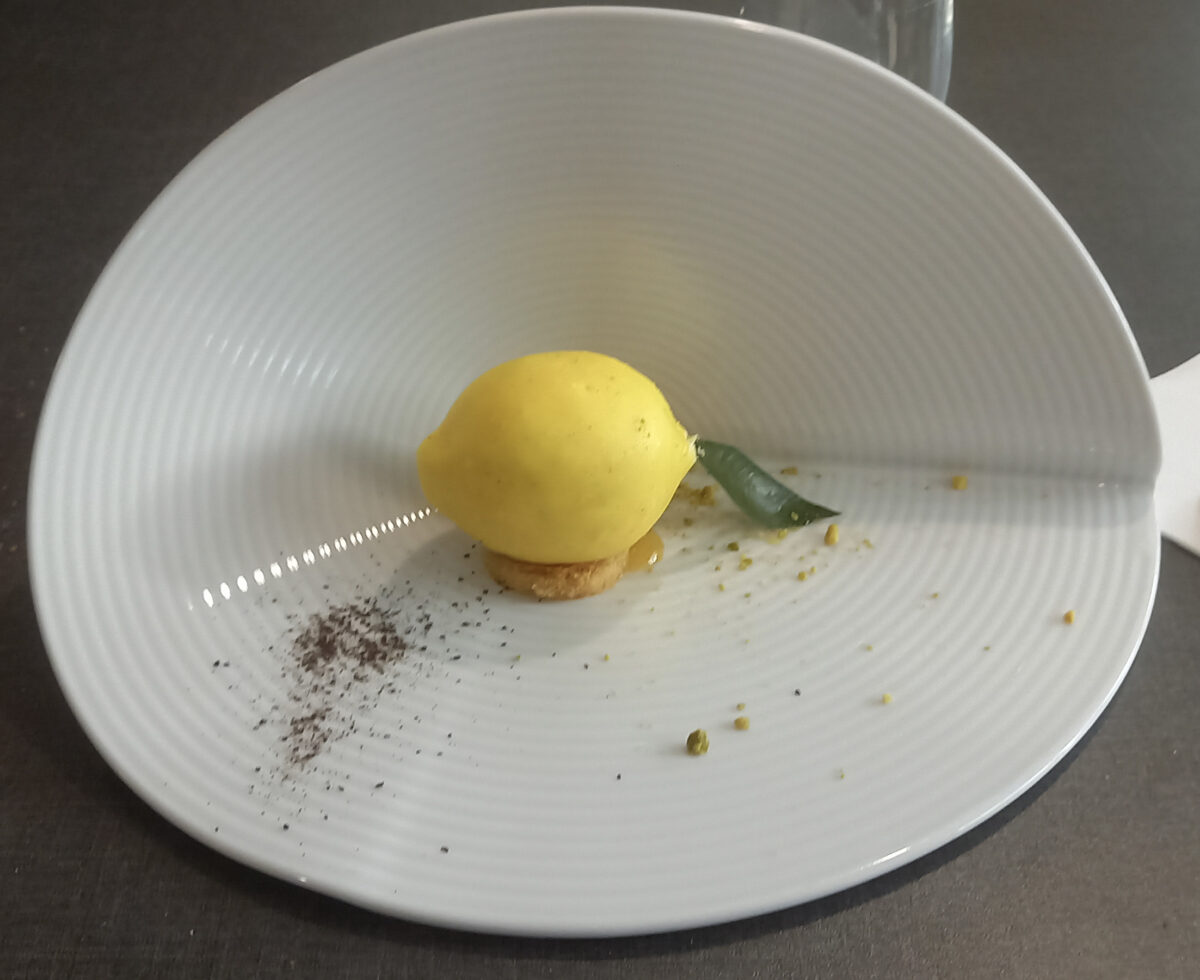 – Pour conclure, le Citron du chef ! Un trompe l’oeil composé de mousse au citron dans une coque de chocolat blanc